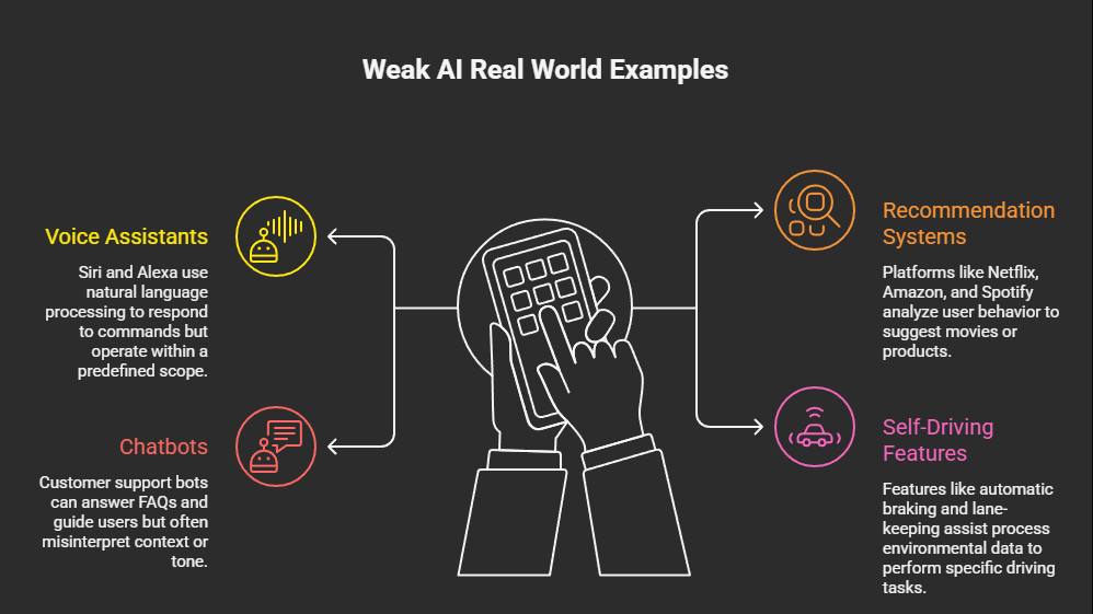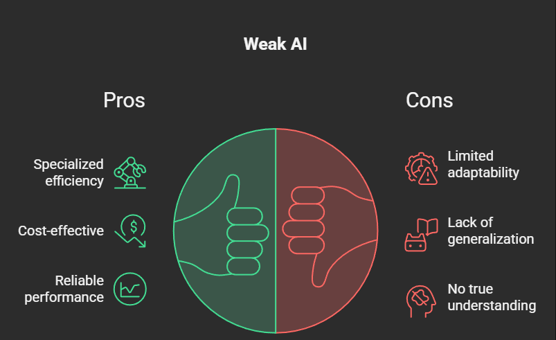 • No Self-Awareness: Weak AI does not have a mind, intentions, or consciousness; it operates based on learned patterns and algorithms.