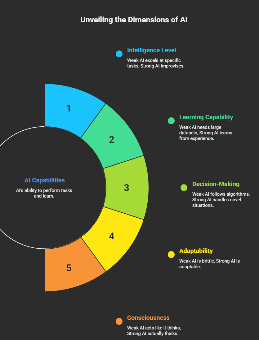 2. Learning Capability: Weak AI requires massive datasets to learn specific correlations. Strong AI would learn broadly from experience, just like you and me.